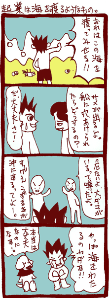 マンツーマンで起業を目指す方のトレーニングをすることもあります。 そういう人と話していると、不安だった昔の自分を思い出します。 町を歩いても、雑誌を見ても、世の中には株式会社や有限会社が溢れています。 しかし、自分が経営者になるということは何か雲をつかむような気分でした。 「彼らに出来たのだから、自分に出来ないはずはない! 俺は絶対に経営者になる!!」 と不安になりそうになるといつも自分に言い聞かせていました。 起業することは海を渡るようなものです。 今いる陸地から、海の向こうの大陸に移動するのです。 その間には広い海が横たわっています。 しかし地球は丸いので大陸の姿は見えません。 あなたの周りの友人や家族があなたにありがたくないアドバイスをしてくれます。 「海は危険だよ」 「何人の失敗した人を知っているよ」 「昔、俺も失敗したんだ。やめとけ。」 しかし、彼らはまだ大陸に渡ったことはないのです。 大陸に渡った経験者はあなたに海の渡り方を教えてくれます。 泳ぎ方。 ボートのこぎ方。 帆で風を捉える方法。 モーターボートのエンジンのかけ方。 いろいろな方法をアドバイスしてくれるでしょう。 しかし、海岸に立つとあなたの心の中に、「もし渡れなかったらどうしよう」という不安がどんどん大きくなります。 ほとんどの人は、海岸で海を眺めるだけで海に出ることが出来ません。 今の季節は波が高いとか、これから嵐がくるかもしれないとかの心配も尽きません。 100%の可能性になるまで出発できない人は航海に一生出発できません。 なぜなら、100%成功する確率には絶対にならないからです。 少し勇気のある人は試しに岸から離れてみます。 しかし、「海を渡る決意」をしていないので海岸の波に押し戻され、波に飲まれるとすぐに岸に戻ってしまいます。 そして自分にはやっぱり無理だったとあきらめてしまいます。 本当に成功したいのならまず必ず海を渡るという「決意」をしてください。 毎日繰り返し決意を固めていってください。 そして70%の可能性で出発しましょう。 残りの30%はあなたの決意から生まれるどんな障害があっても絶対に成功するんだという「熱意」と、自分なら必ずできるという「自信」で埋められます。 海のかなたのこの大陸がなくなることはありません。 一度渡ってしまうと、意外とたいした距離はないし、伝説のクラーケンや、船を飲み込む渦潮は迷信でしかないこともわかります。 海の向こうの大陸にはお金が溢れ、自由な時間あります。 そして今の土地では決して得られない自分で決められる自由があります。 ■2005年からのツッコミ■ いい話です。(笑) でも、少しプラス思考に偏っていますね。そして「怖がってはいけない」という思い込みが見えます。 「恐れてはいけないんだ、不安になってはいけないんだ」と、そういうマイナス感情を 否定していると本当は恐れたり不安になる自分を見逃してしまいます。 見逃していると対処できなくなってしまいます。特に人にそれを見るようになります。 だから、当時は起業に対して不安になって足を踏み出せない人を見ると許せないと感じたものです。 不安な自分もしっかりと感じて、その上で勇気をもって進むことを選ぶといいですね・・・昔の自分に教えてあげたいです。