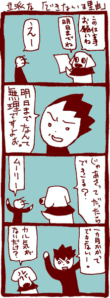 能力の差は考え方の差です。 「○○だから出来なかったのは仕方が無い」と考えたり、言ってしまったことはありませんか? 成功しない人は上手くいかないのを環境のせいにしたり、他人の原因にしたりするクセが出来上がっています。 そして、出来なかったことを正当化して安心する。 たとえば、 売上目標が達成できなかったのは、今月台風が来たから当然だ。 タバコを辞められないのは、ストレス発散のためだから仕方が無い。 不景気だから会社が上手くいかないのは仕方が無い。 この1年間、新しいことを始めなかったのは仕事が忙しかったからだ。 どれも一見もっともな理由です。 あなたには責任が無かった様に見えます。 しかし、これらの結果の責任は誰がとるのでしょう? 大抵、問題はもっと大きくなってあなたに襲いかかってきます。 売上が上げられなければ、あなたの評価と収入が減るし、会社も潰れます。タバコを辞めなければ年を取ってから大きな病気になります。 新しいことを始めなければ、気づいたときには時代遅れの旧式な人間になります。 すべての問題を外部のせいにして自分を納得させては、いつまで経ってもよい結果は偶然にしか生まれません。偶然は滅多に起きません。つまり成功しないと言うことです。 できない理由は自分にあると考えなければ、いつまで経っても解決できません。しかし解決できない問題なんてそうはやって来ないものです。 結果に対して責任を取ることを決意した時から、成功が始まるのです。 ただし、本当にどうあがいても無理なものは受け入れましょう。 悩むだけ時間の無駄です。 ■2005年からのツッコミ■ 良いこと言っていると思います。(笑)