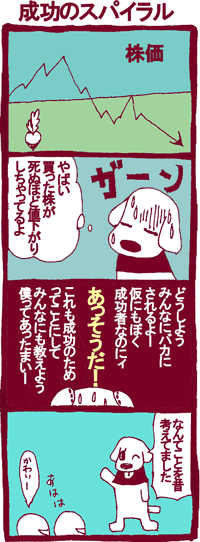 前回のコラムでポジティブな反応について書いたので、今回はもうちょっと深い部分を書きましょう。 マクドナルドの株を僕も公開時に買いました。 100株で43万円でした。 ところが現在は20万円です。 20万円以上の値下がりです。 僕と同じようにマクドナルドの株を買った人は、それぞれの捉え方をしていることでしょう。 多くの人は「ちくしょう~損した~」と嫌な気持ちになっているでしょう。 また、「株とはこういうものだ」と平然としている人もいるでしょう。 中には値下がりしたことを喜んでいる人もいます。 ここで重要なことは「事実には意味がない」ということですね。 値段が下がって20万円分の資産が減少したに過ぎません。 それだけです。良い事でも悪いことでもありません。 ちなみに僕はどう捉えていると思いますか? 僕にとっては、マクドナルドの株が値上りしても、値下がりしてもどちらも同じだけ嬉しいのです。 ちなみに僕はろくに調べもせずに話題になっているというだけで購入しました。(失敗する典型的なパターンですね)だから上手くいかなかったのは当たり前です。 ではなぜそんなことをしたのか? 僕は近い将来、資産形成の方法を人々に教えたいと思っています。 株取引の”失敗”経験を出来たことは収穫です。 経験の無い人たちに勇気を与えるためには上手くいった事例だけではなく、失敗した事例も必要だと思います。 では、僕がなぜ資産形成の方法を人々に教えたいのか。 起業という方法だけでは無く、投資と言う方法を教えられれば、より多くの人の経済的な成功に貢献できるからです。 なぜそう考えるのか。 それは僕の人生の目的の一つが 「一人でも多くの人の成功に貢献すること」だからです。 僕の頭の中の流れはこんな感じです。 犬飼はかっこうつけて書いているな、と思ったあなたは正常です。普通の人は素直に受け入れがたい考え方です。 しかし世の中で大きく成功している人々は実際にこう考えているのです。 僕が成功しているのは彼らの考え方をマネして自分のものにしたからです。 悩んでいる人、苦しんでいる人は自分の偉大さや安定した状態が目的の中心になっています。「自分のため」だけを目的にして何かをすると、つい予想外の出来事を悪い意味に取りがちです。 しかし、人への貢献を人生の目的にしたとき、すべての出来事がプラスの意味を持った”役立つこと”になります。 そしてすべてが上手く回りだし、成功のスパイラル(螺旋)に乗っていくのです。 最後に僕の理念のひとつを書きます。 <理念> 他の人の成功に貢献した時、 最も大きな成功を手に入れる。 ■2005年からのツッコミ■ 鳥肌が立ちました。 なぜって、自分ですっかり自分を騙して、本気でそう思っているからです。(笑) こういうのを「やせ我慢で無理している」というんですね。 このときの本心を書きます。 あ、株で失敗しちゃったよ。格好悪いなあ。みんなには成功者って思われているしなあ。 人には言えないなあ。 あ、そうだ。これはどう解釈したらポジティブになれるだろう? 失敗を他の人の成功につなげればいいんだ。 そうだそうだ。 なんだかそんな気がしてきたぞ。 そうだ、本当にこれはいいことなんだ。いえーい。コラムにも書いちゃおう! 本当は、株価が下がってすごいがっかりしてるし、 「本当は自分ってたいしたこと無いんだよな」と自分自身にガッカリもしたし、 みんなに格好悪いところ見せたらいろいろなものを失ってしまうのではないかと恐れていたんです。 だから、そういう感情は見ないことにしちゃって、更には「マイナス感情なんて感じてないもんね」 と本気で思い込むようになっていました。 なかなかカワイイやつじゃありませんか。 ところが、こうすると、どんどん自分の中が分離しちゃって、次第に、 失敗してネガティブになっている人が許せなくなるんですね。 この頃から、たくさんの許せない自分を抱えて行くのでした。