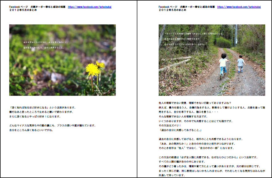 Facebookに投稿した「メッセージ入り写真」を解説と共にをまとめました。まさに保存版! 2012年5月分。全33ページ。書籍化される予定です。 |
