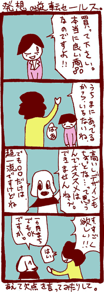 今もいろいろな人に会っていますが、ビジネスで成功している人の多くはセールスの経験があるものです。そういえば「金持ち父さん」の著者のロバートキヨサキ氏もセールスをしていましたね。 その理由の一つにセールスは特殊な資格無しに高収入が得られると言う点が挙げられます。そもそも起業を目指す人なんて高収入にあこがれている人がほとんどだから、一度はセールスに手を出すみたいです。 セールスで成功する方法は2つが考えられます。 1つは数を追う正攻法。もう一つは発想の転換。 今は経営者になって成功している人は発想の転換で売上成績を上げた方が多いようです。 以前お会いした方は、やはり昔セールスをしていていろいろな所でトップになったそうです。感心するくらい奇想天外な発想のできる人なんですが、その中でも笑ったのが「犬に噛まれてオーダーを取る」と言う方法。 どうにかして売上を上げたい時に思いついたのが、大きな家を見つけてそこの犬を殴るのだそうです。当然そうすると犬は何だこの野郎!と噛み付きます。そうして飼い主に「お宅の犬に噛まれました。せめてうちの商品を買ってください」と言えば、絶対に契約してくれたそうです。 犬好きの僕としては許せませんが、起業家の僕としてはこういう、既成概念のブッ取れた話は大好きです。 基本的にセールスで成功するには必要な能力を練習し磨かなくてはなりません。それは、人間関係を短時間で作る能力、相手のニーズを質問して理解する能力、相手のニーズに合わせてこちらの要望を伝える話し方と言ったものです。こうした基本のスキルの上に、奇想天外なアイディアが重なればすごい結果が出るものです。 それはどうしても売上を上げたい。みんなと同じことをしていては一番になれない。何かよい方法はないかと頭を目一杯働かせて出てくるアイディアです。 必死に考えればあなたの既成概念もぶち壊せますよ。 ■2005年からのツッコミ■ 特にありません。 セールスをしていなくて成功している人もいますが、そういう人は、 地位や名声を使わずに人を動かす感覚を持っています。